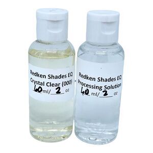 You will get 2 ounces each of Redken Shades EQ Crystal Clear (000) & Redken Shades EQ Processing Solution. Both are in clear labeled bottles and are enough for more than one application. The mixing ratio is 1:1. They can also be added to other Redken Shades glosses to lessen the intensity or level of a shade.
