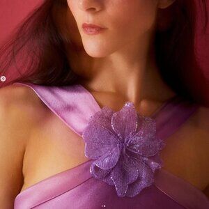The most characteristic detail of this design is the flower embroidered with sequins and beads in the center of the neckline.