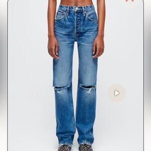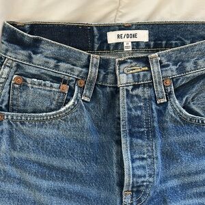 Redone 90s high rise loose jeans with a distressed look. Dark blue denim. Perfect for casual wear. Straight leg with an amazing fit and length!!