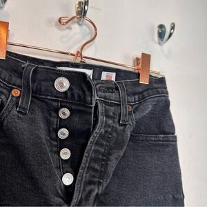 Re/done button fly dark was destroyed skinny fit busted knees raw hem
