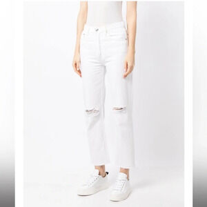 Keywords: Re/Done 70s stove pipe jeans, white distressed denim, cropped straight leg jeans, Re/Done size 23, raw hem jeans, premium designer denim, NWT Re/Done jeans