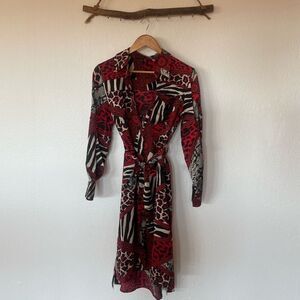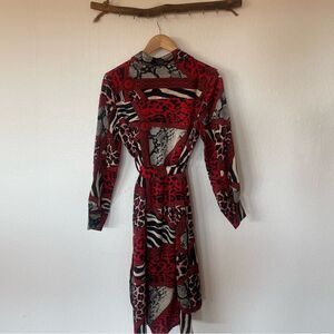 Red long sleeve printed button up dress with sleeve slit detail