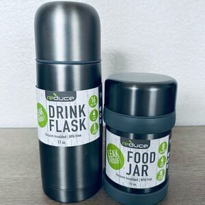 NWT and unused dark gray metallic vacuum insulated drink flask and food jar travel mugs set. Screw on lid.