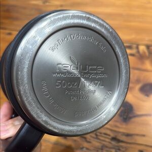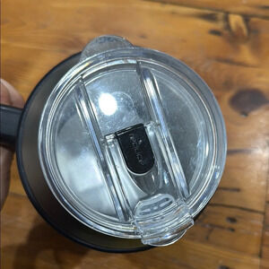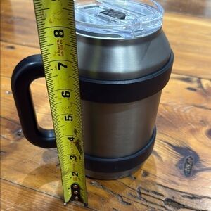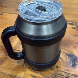 Sleek stainless steel mug with a sturdy handle. Features a clear lid for easy sipping. Doesn’t include straw. Preowned.