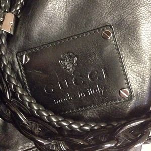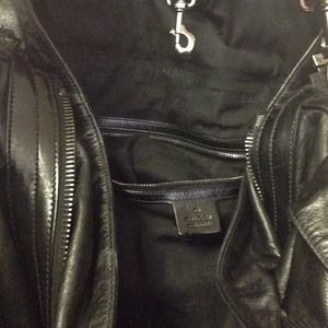 Brand new condition. Used only a few times. Black leather exterior and black interior with Gucci print all over. Handles with clasp to close as well as large strap. 2 exterior side pockets. One inside pocket. Decorative chain. Huge and stylish. Great for overnight bag or for travel. If too high I will take offers.