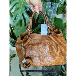 This NWT Stella Bianca Italy genuine leather purse is a luxurious and spacious accessory perfect for travel, casual outings, workwear, and business settings. The extra-large rectangular satchel/top handle bag features double cognac handles, a zip closure, silver hardware accents, and a floral embossed pattern finish. Made with Italian soft embossed leather, this rare model comes with a detachable strap, original dust bag, and adjustable cross-body strap for added versatility. Its classic design and lightweight construction make it a chic and practical choice for any woman on the go. Should fit a laptop or diaper bag contents easily! Beautiful medium brown cognac.