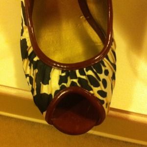 Satin black and white design fabric. Open toes. Strap in the front. Pre loved but in wonderful condition! No stains, scuffs, or rips.