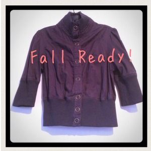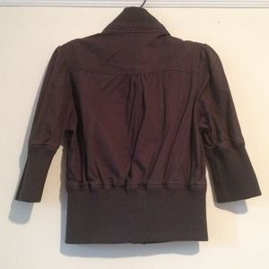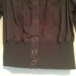 Dark grey biker jacket, cargo style with stretchy bottom and sleeves. Sexy and fun! Bronze snap button closure. Excellent condition!