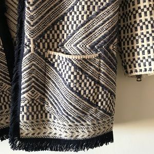 Sweater knit jacket with woven texture. Open-front geometric design with navy fringe trim. Three-quarter sleeves with silver zippers. Heavy weight sweater with expensive feel. Chic, polished wardrobe staple. Few minor snags as pictured.