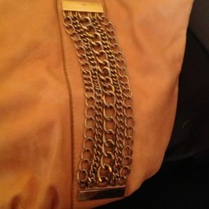 Medium sized pink handbag. Chain detail in front. Good amount of space inside. Slightly used.