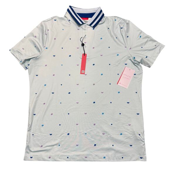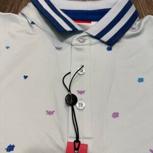 The design features a dispersed bee, lion, and heart pattern inspired by land, air, and romance, with a ribbed spread collar and 3-button placket. Perfect for golf, casual wear, or layering under a blazer.