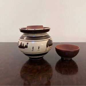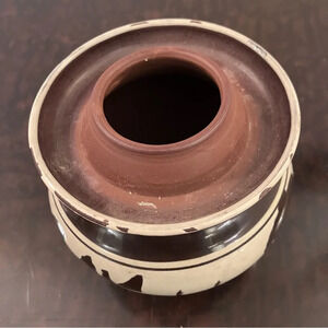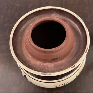 Redware pottery tumble up. Southwestern pattern. Some chipping on rim. Please see photos for condition. I’m not sure if it originally had a stopper for the carafe. Approximately 6in high.
