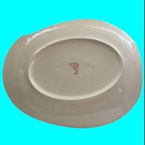 This vintage Red Wing Pottery platter features a Dogwood pattern with handpainted blue flowers on a white ceramic base. The platter is 15 inches in size and has an unusual shape. It was made in the United States using pottery production techniques. The backstamp is printed on the piece.