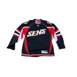 The product is a Reebok 2009 Ottawa Senators hockey jersey in black, Men's size small. This officially licensed jersey is perfect for fans of the National Hockey League (NHL) team, featuring the team logo and colors. Made in Indonesia, this jersey is ideal for game days or showing support for the Ottawa Senators during the regular season.