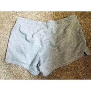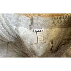 Comfortable and versatile Reebok athletic shorts in light heather grey. Features an elastic waistband with drawstring closure and side pockets. Made from soft cotton blend material perfect for workouts, lounging, or casual wear. Classic Reebok logo embroidered on leg. Excellent for gym sessions, running errands, or relaxing at home.
