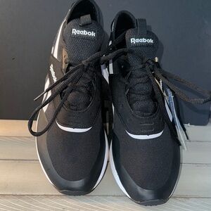 These Reebok athletic shoes boast a sleek black mesh upper with subtle white accents, offering a modern and versatile look. Designed for both performance and casual wear, they feature a minimalist silhouette that complements any outfit. The black midsole with white detailing adds a touch of sophistication to these stylish shoes.
