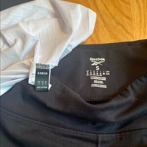 Sleek black leggings with bold Reebok logo and SHEIN Soft white tank top with open back design.