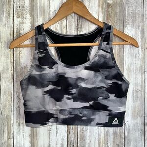 Experience comfort and style with the Reebok Women's Sports Bra in a chic black and gray pattern. Perfect for workouts or casual wear.
