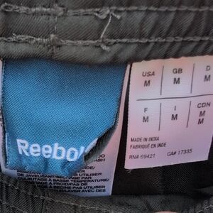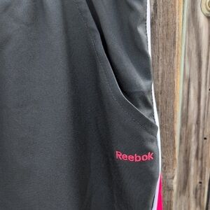 Reebok pants featuring a sleek black design with vibrant pink and white stripes. Ideal for active wear. Like new condition