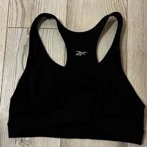 Stylish Reebok sports bra. Features bold pink logo. Comfortable and supportive.