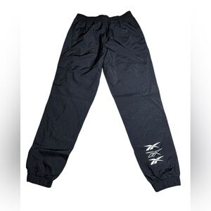 Reebok black jogger pants in size small, featuring a relaxed fit with an elastic drawstring waistband, cuffed ankles, and a single utility cargo pocket for added function and flair. Lightweight, slightly crinkled fabric for a streetwear-inspired edge. Perfect for training days, errands, or pairing with a crop top and sneakers for a sporty casual look. Excellent condition.