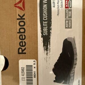 Experience superior comfort and style with Reebok's black and white athletic shoes, featuring a breathable mesh upper and a supportive white sole for optimal performance. Alloy Safety Toe. Men’s 7.5 // Women’s 9.5