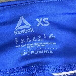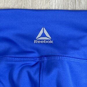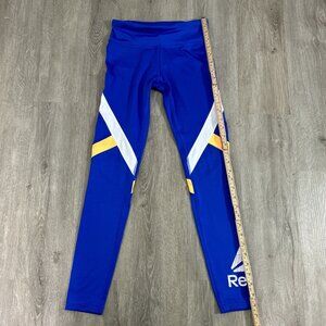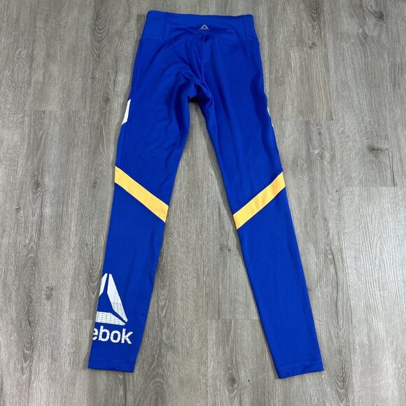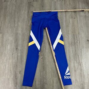 Stylish Reebok track pants. Vibrant blue with yellow accents. Perfect for workouts or casual wear.