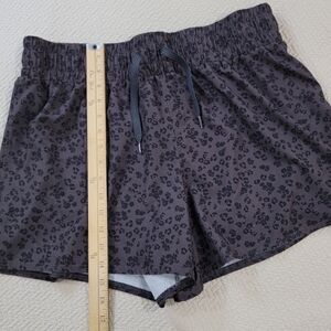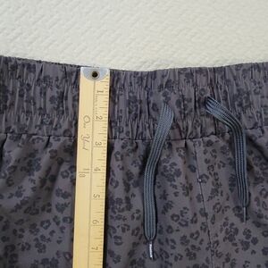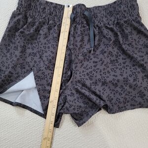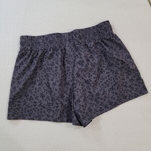 Bruen and black shorts with a subtle leopard print. Features an elastic waistband with a drawstring. Activewear, casual, workout shorts.