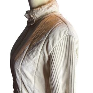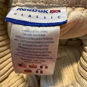 Reebok Classic Quilted Cotton Zip Jacket, Ivory Vintage, Women's Size Medium. Stay cozy and sporty in this quilted jacket, a stylish blend of comfort and heritage. Made from a soft cotton/spandex blend, it features ribbed knit sleeves, a lightly padded body for warmth, and a high mock neck with a subtle ruffle trim. The front zipper closure and tonal ivory hue make it an easy layering piece for any casual look. 96% cotton, 4% spandex. Excellent condition.