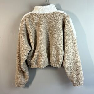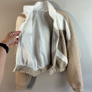 Cropped Sherpa jacket in beige and white. Logo on front in green
