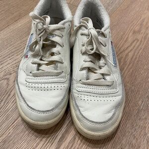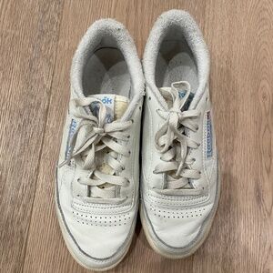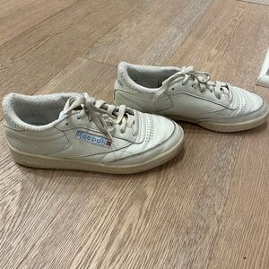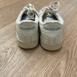 A light hue gives these leather Reebok sneakers, retro appeal, while blue logo lettering as a playful pop of color to a classic silhouette. Cowhide leather, padded collar and tongue, contrast logo details, lace up closure, round toe, rubber soul. Worn.