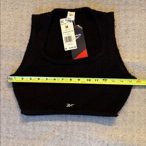 Comfortable, stylish black crop top and biker shorts matching set with simple Reebok logo. Perfect for casual wear.