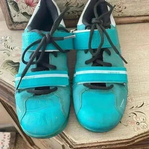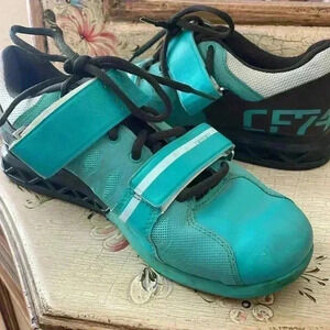 Lots of life left in these size 7 CF74 lifting shoes, some scuffing on right toe, teal in color and ready to be loved again! Size 6.5 grey and maroon CrossFit shoes loved but still have plenty WOD’s left in them! I wore both similar in size, lifting shoes didn’t come in half sizes back in the day.