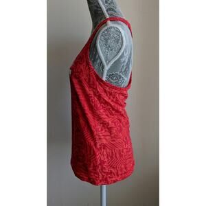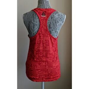 Red burnout racerback workout tank. Small CrossFit graphic on front. Reebok logo on back.