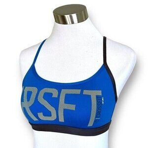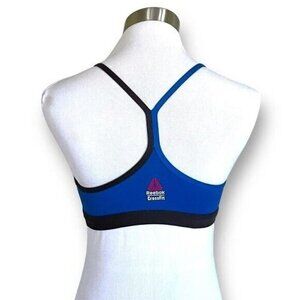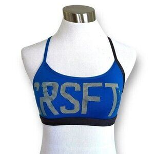 Reebok CrossFit Womens Sports Bra Sz XS Blue Yellow Graphic Spellout Racerback