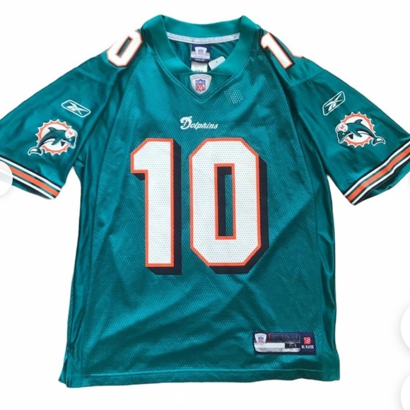 Teal jersey featuring number 10. Includes Dolphins logo and Reebok branding.