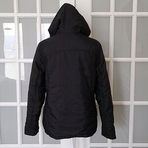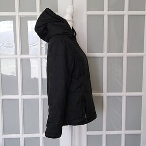 Comfortable hooded reversible puffer style jacket that is perfect for staying warm on outdoor adventures. Has a total of 4 pockets, 2 outside zipper pockets on the hard shell and 2 slip pockets on the faux fur side.
