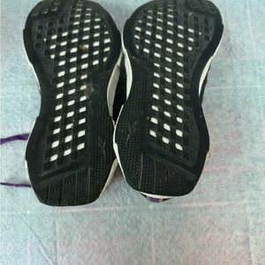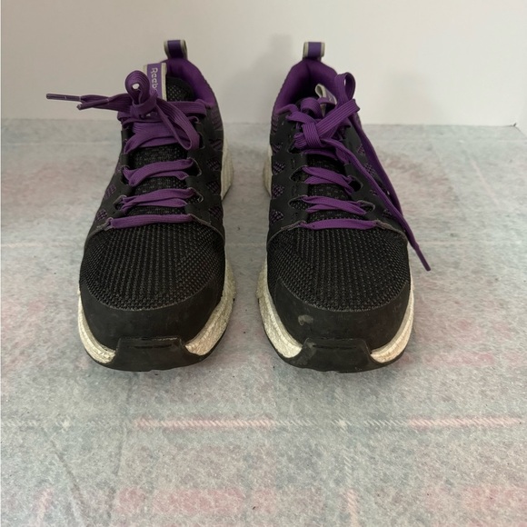 These Reebok Fusion Flexweave Composite Toe Work shoes were worn a few times. They are mostly black with some purple trim/laces. Women’s size 6.5W. The white area around both balances look dirty and did not try to clean them. It could be the way they are made.