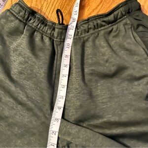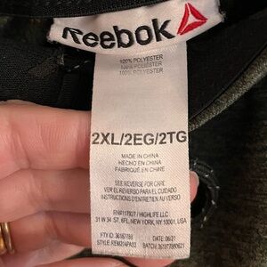 Reebok drawstring Joggers in gray and black. Racing Stripe on each side. Two front pockets and one zipper back pocket. Zippers at the legs. Stretchy waist hard to measure but sized 2XL. Rise is 12 inches and length is 26. Waist is adjustable but The way it is now is 18. One spot on front leg that is darker.