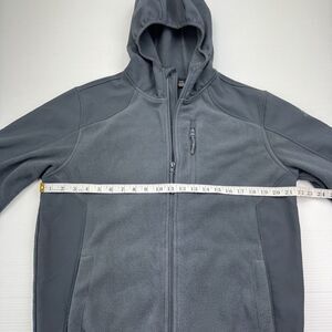 Mens Reebok jacket gray hooded fleece jacket is designed in a size medium and features a classic full-zip closure along with soft shell accents and a Reebok logo.