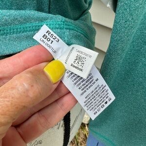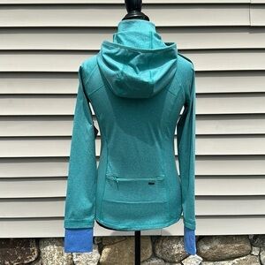 Pretty green heather long sleeve 1/4 zip, with blue heather cuffs complete with thumb holes to keep your hands warm on your winter run. Reflective strip edges front zip. Back zippered media pocket. Reflective strip at back of neck. Mock neck with hood. Soft fleece lining. An athletic slim fit that moves with you.