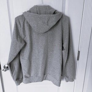 Pre-owned but never worn, this is a Reebok “half-zip” hooded sweatshirt. The zipper is fully functioning. It also has a front pocket with Velcro closure. Size is 18 XXL. Measurements are: 25” long; 19” armpit to armpit, & 21.25 underarm sleeve length. Machine wash & dry. This sweatshirt is sized for young men/teen but can be worn by any gender. The color is light grey with a black zipper and black trim.