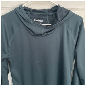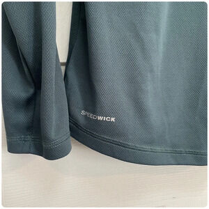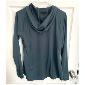 Green running long sleeve layer top with hood. Style is called “speed wick”.
