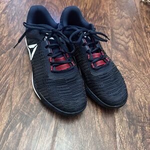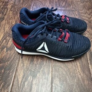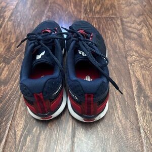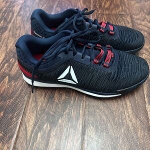 Sleek Reebok shoes with black mesh and red details. Lightweight and supportive.