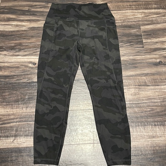 Size M. Olive green camo. Has cell phone pocket on both sides