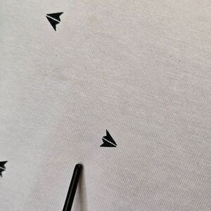 Reebok Men's Purple All Over Graphic Paper Plane Print Short Sleeve T-Shirt M. Print is arrows or paper planes in black and white. Crew neck line. 100% cotton. Color is a very light purple.