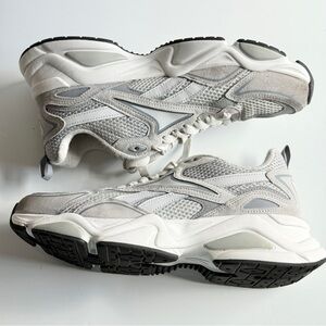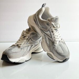 Features a neutral gray and beige colorway with a mix of suede and mesh panels. Retro chunky sole design for comfort and style. Great for casual wear, walking, or lifestyle outfits.