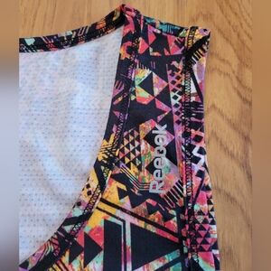 Dynamic Reebok athletic tank with striking geometric design. Features a blend of vibrant colors. perfect for yoga or running.
