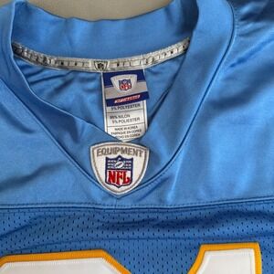 This Reebok NFL Equipment San Diego Chargers LaDainian Tomlinson football jersey delivers classic team style in powder blue with bold lightning bolt sleeve accents and #21 front and back detailing. Constructed from durable nylon/polyester mesh with embroidered details, tagged size 52 (2XL), and in pre-owned, excellent condition.
