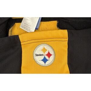 The Reebok NFL Team Apparel Pittsburgh Steelers Hooded Sweater in Medium is an officially licensed garment perfect for football fans. Made for men, this black sweatshirt features the iconic Pittsburgh Steelers team logo, making it a stylish and comfortable option for showing support during the regular season games. Made in China, this high-quality sweater is designed for fans of the National Football League who want to represent their favorite team with pride. Pit to pit is 22 inches. Top of shoulder to bottom is 27 inches. Sweatshirt has a few small dirt marks on front (see photo).
